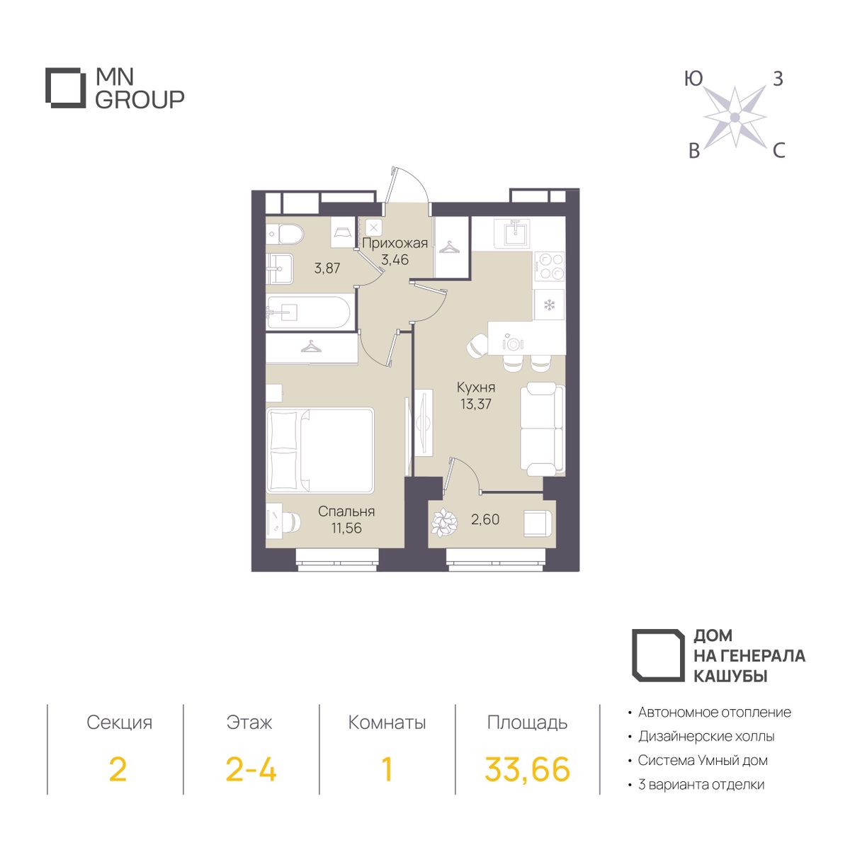 1-комнатная33.66 м²